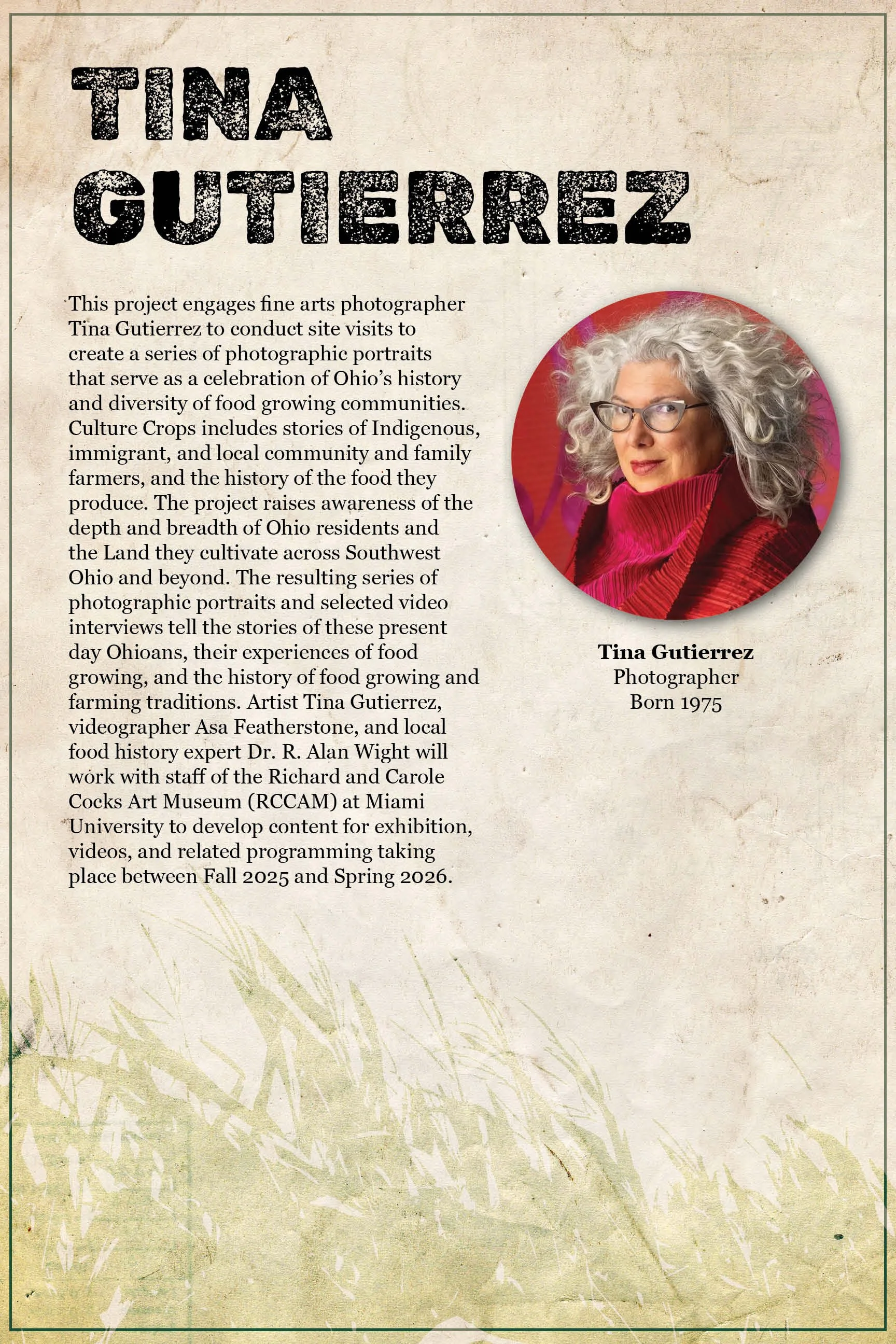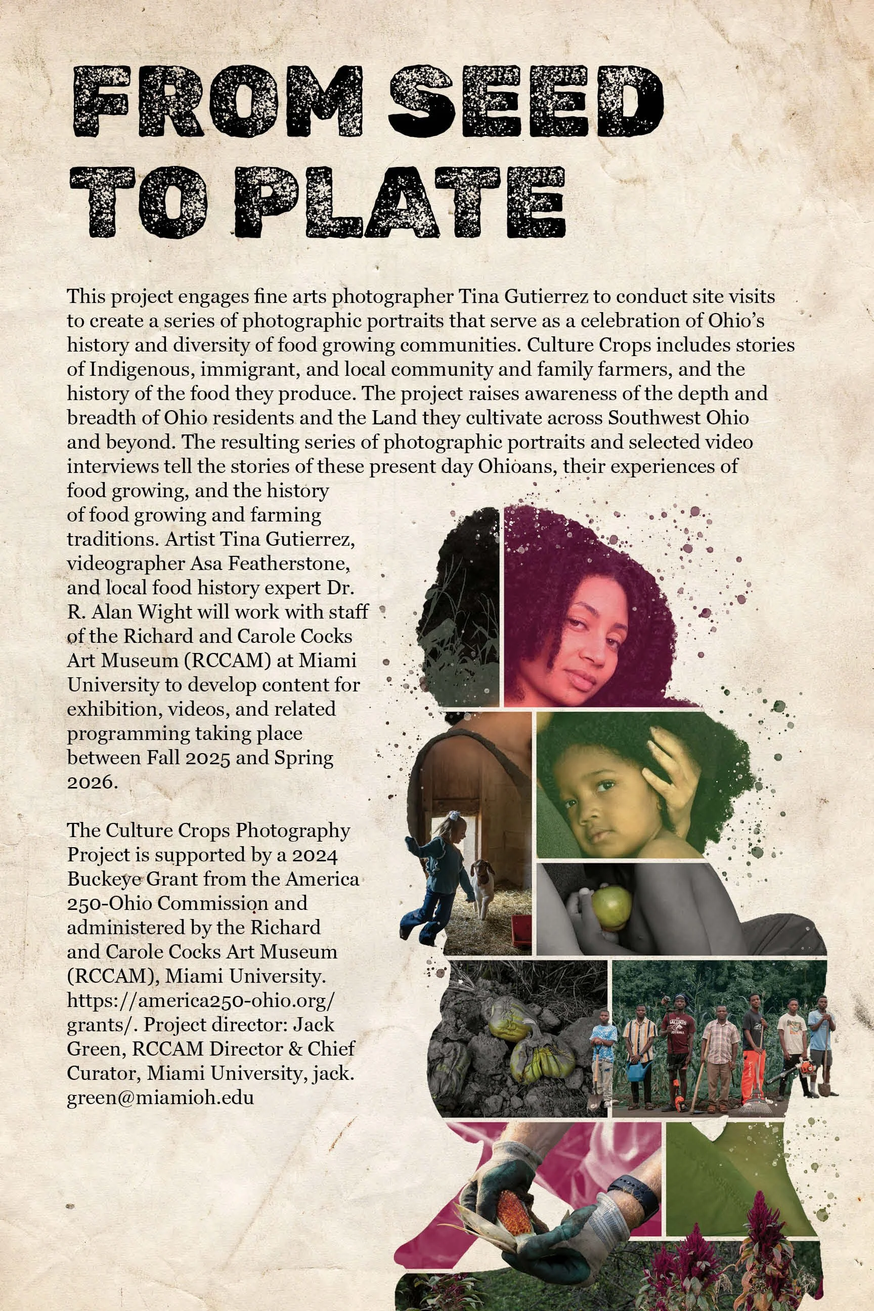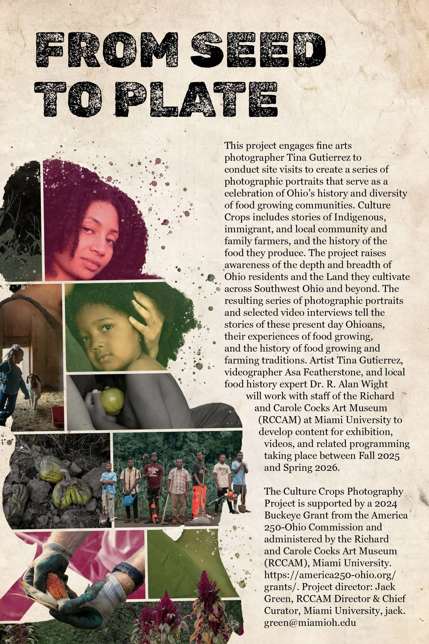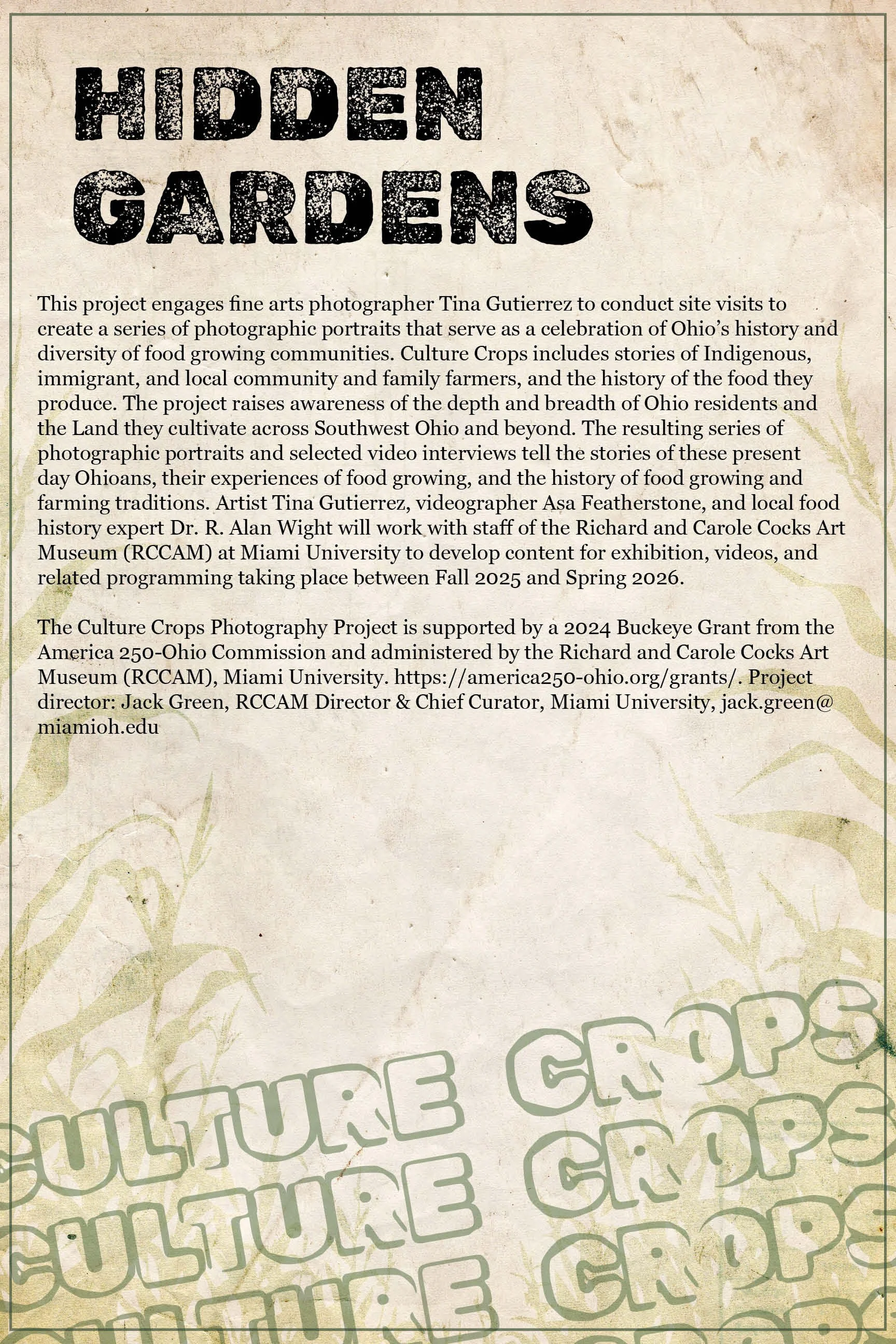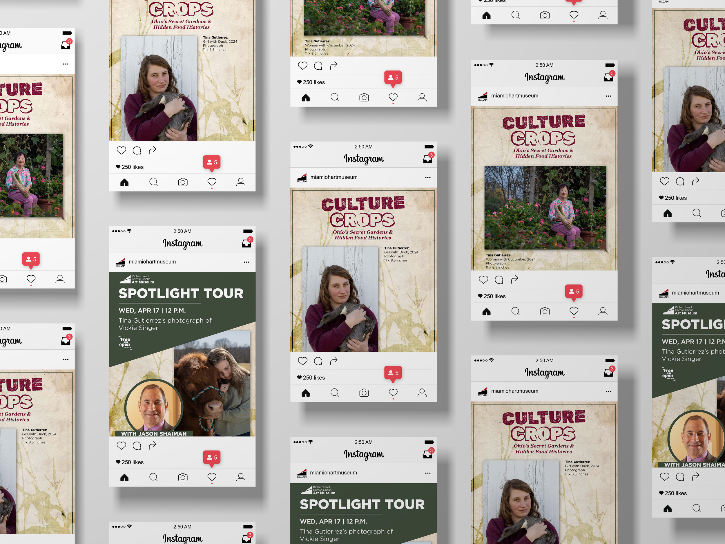 As a graphic designer at the Richard and Carole Cocks Art Museum (RCCAM), I worked on 'Culture Crops: Ohio's Secret Gardens and Hidden Food History'. It showcases photographic portraits that celebrate Ohio’s food history through the stories of Indigenous, immigrant, and local farmers. The exhibition explores themes of sustainability, stewardship, community, identity, and heritage. It was through iteration that I refined my ideas into strong design decisions.