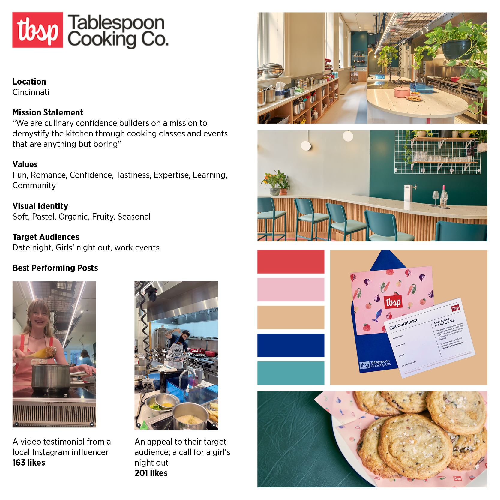 To develop Soyful Studios, I began by benchmarking existing cooking studios to understand how they positioned themselves and engaged with their audiences. I studied brands like Tablespoon Cooking Company, Sprouts Cooking School, and Cozymeal, examining their missions, values, social media strategies, and visual identities. These insights shaped Soyful Studios’ playful, vibrant personality.